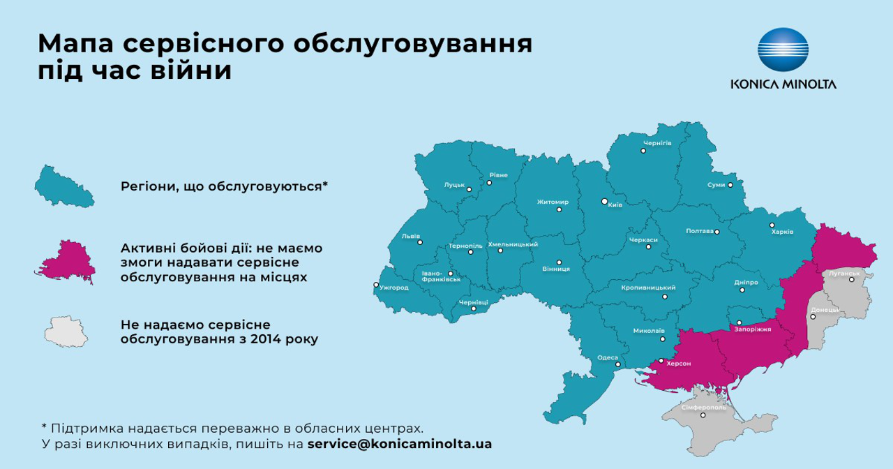 Konica Minolta відновила надання сервісних послуг своїм клієнтам у переважній більшості регіонів попри активні бойові дії на сході та півдні України.